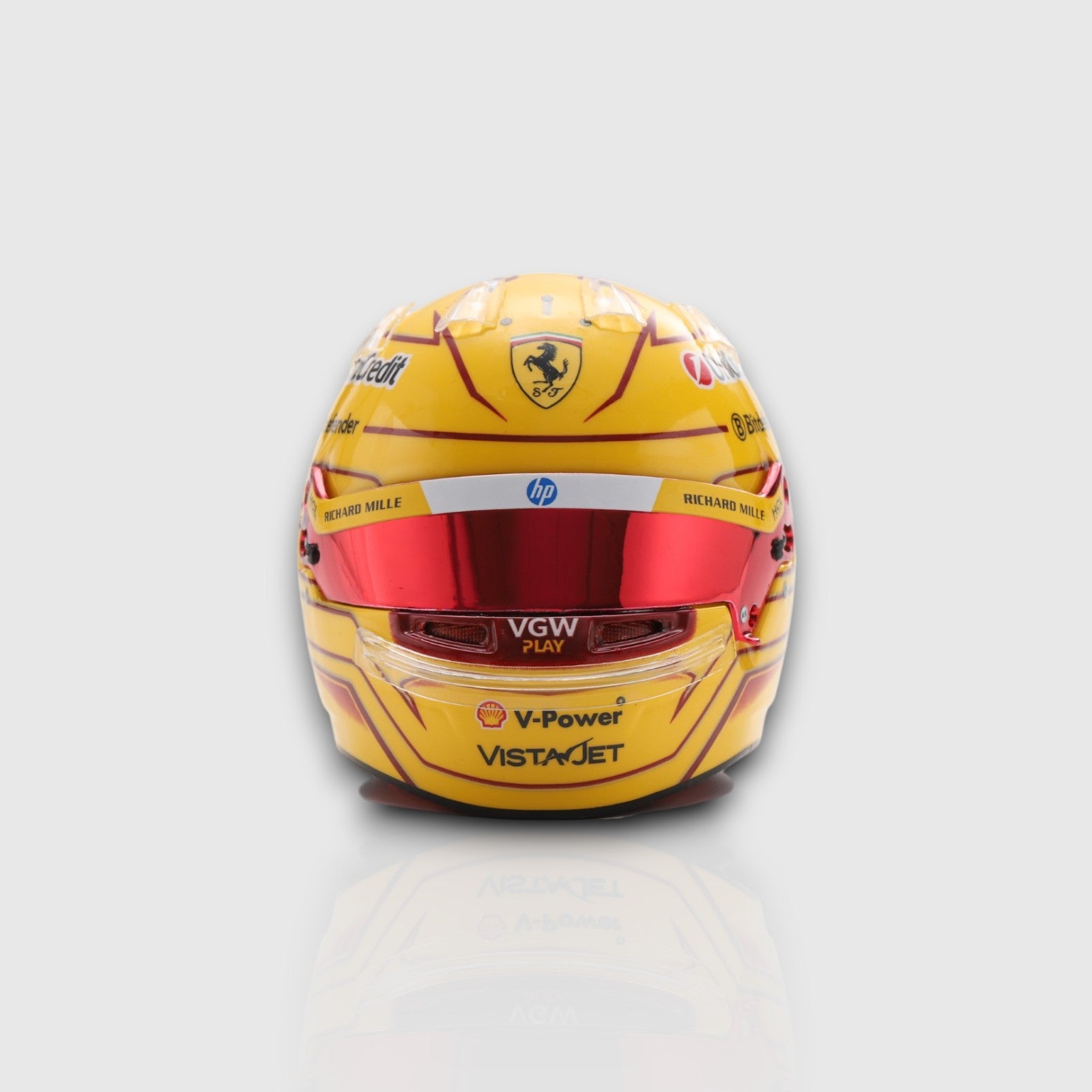 Meticulously crafted with incredible attention to detail, this F1 scale model replicates Hamilton’s 2025 helmet design, featuring the signature Ferrari red and personal graphics that reflect his racing legacy. Whether displayed alongside your Formula One car model collection or showcased on its own, this mini helmet radiates speed, heritage, and championship spirit.