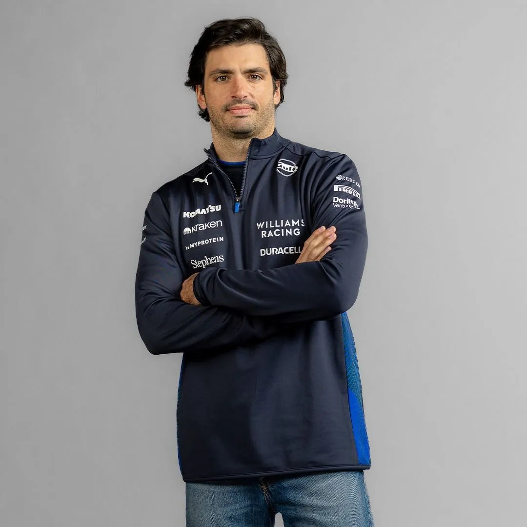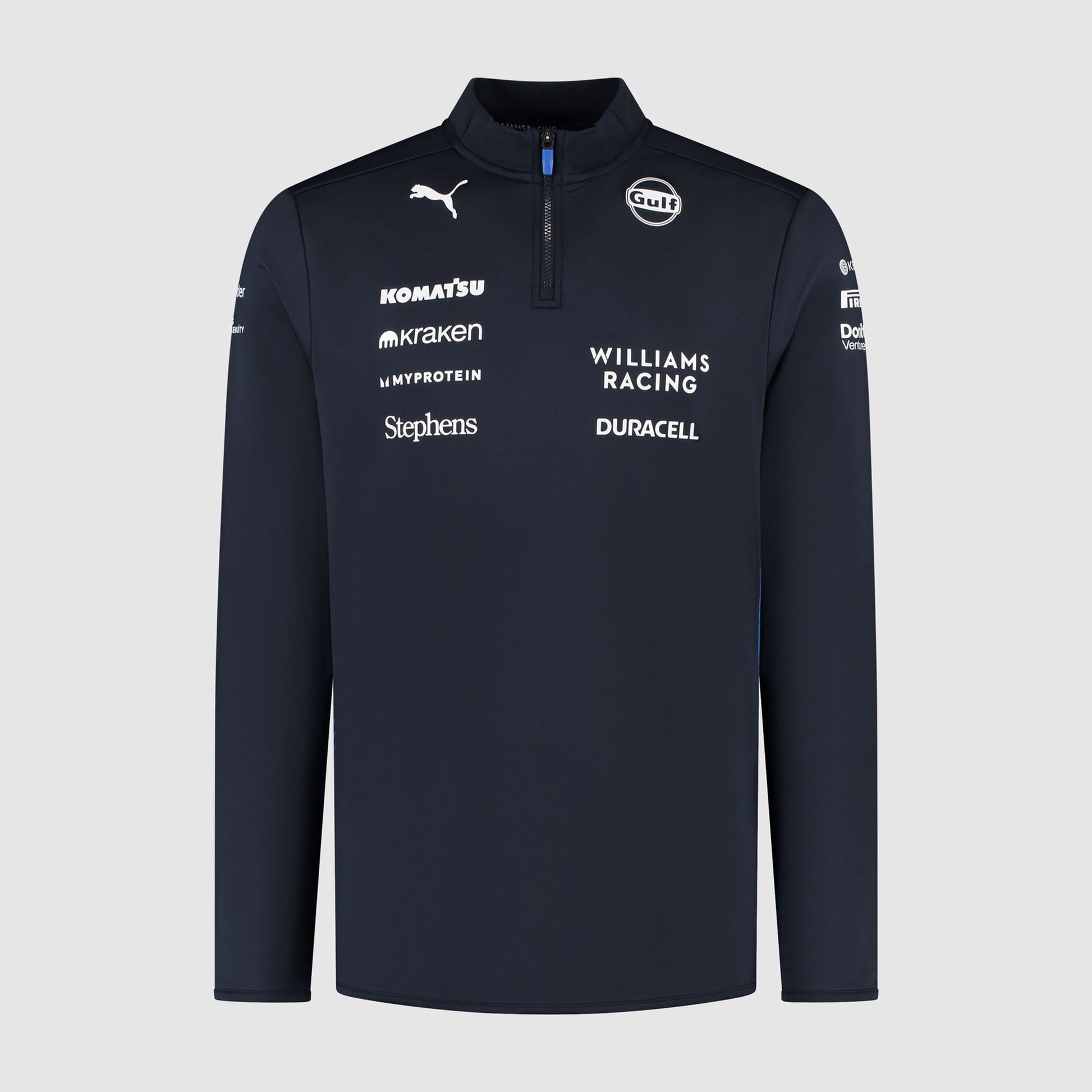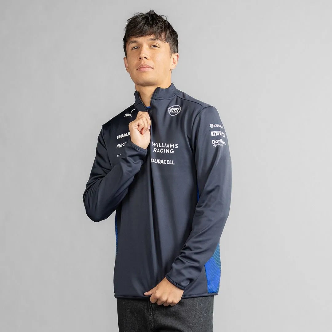 The official 2025 Williams Racing PUMA Team Sweater as seen worn by the team and drivers throughout the Formula 1 season. 1/4 zip collar, bound cuffs and hem, and all the official 2025 team and sponsor branding.